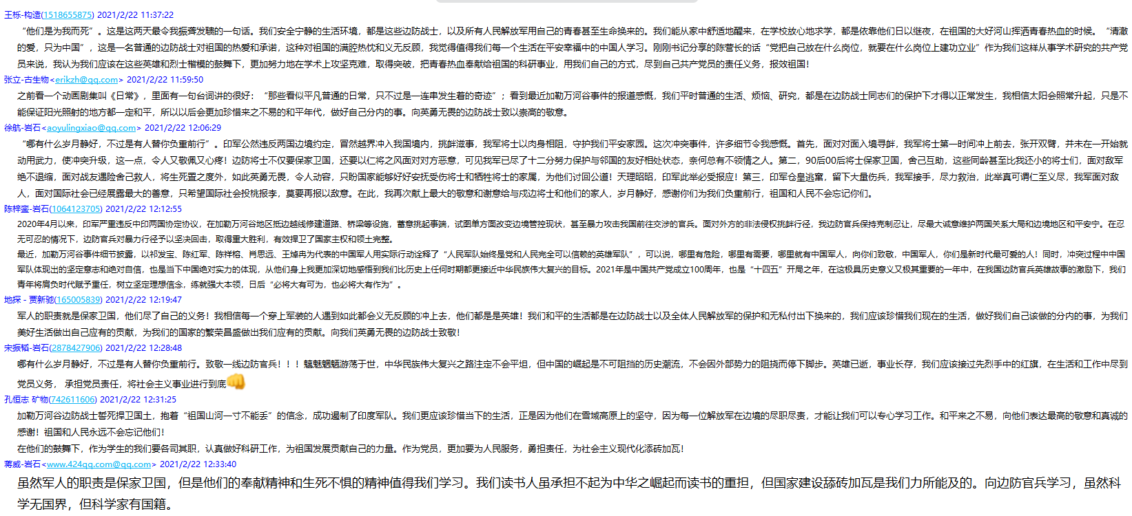 在科研经验分享讲座之后,石静同志主持了下一个议题——深入学习加勒万河谷战斗英雄先进事迹。石静同志介绍了中印加勒万河谷冲突的始末,在这一冲突中,涌现出祁发宝、陈红军、陈祥榕、肖思远、王焯冉等英雄人物。“胸膛迎向重围,后背留给祖国”,这是人民子弟兵的英雄本色。“党把自己放在什么岗位,就在什么岗位上建功立业”“清澈的爱,只为中国”“我们就是祖国的界碑”这是英雄们的内心独白,也是所有党员学习的榜样。