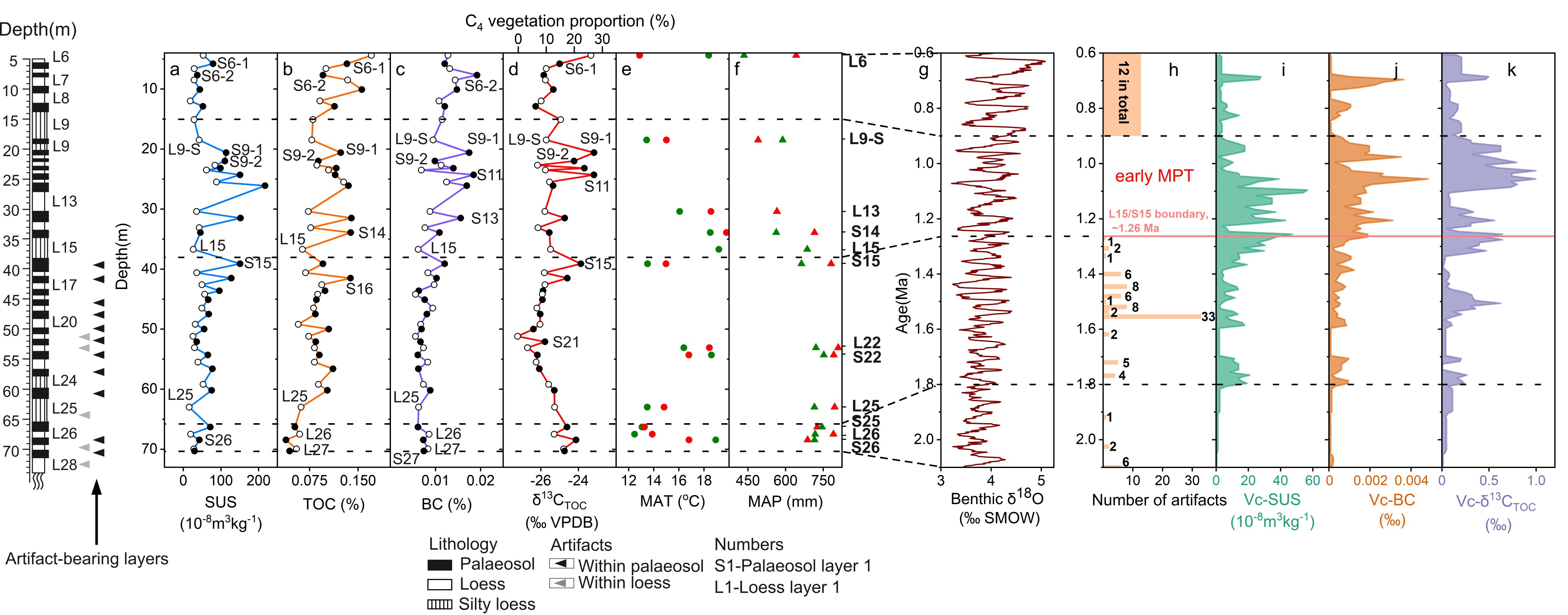 304永利集团官网入口周斌副教授及其合作者利用有原位石器出土的上陈剖面黄土–古土壤沉积序列(图1),开展了黑碳、有机碳及其碳同位素组成,以及细菌膜脂化合物br-GDGTs等有机地球化学指标分析,重建了该地区~2.1–0.6 Ma间的气候和植被环境变化,并将之与该地点发现的石器记录对比,在上陈地区划分出了四个特征明显的气候–环境–人类活动阶段(2.1–1.8, 1.8–1.26, 1.26–0.9, 0.9–0.6 Ma)(图2)。