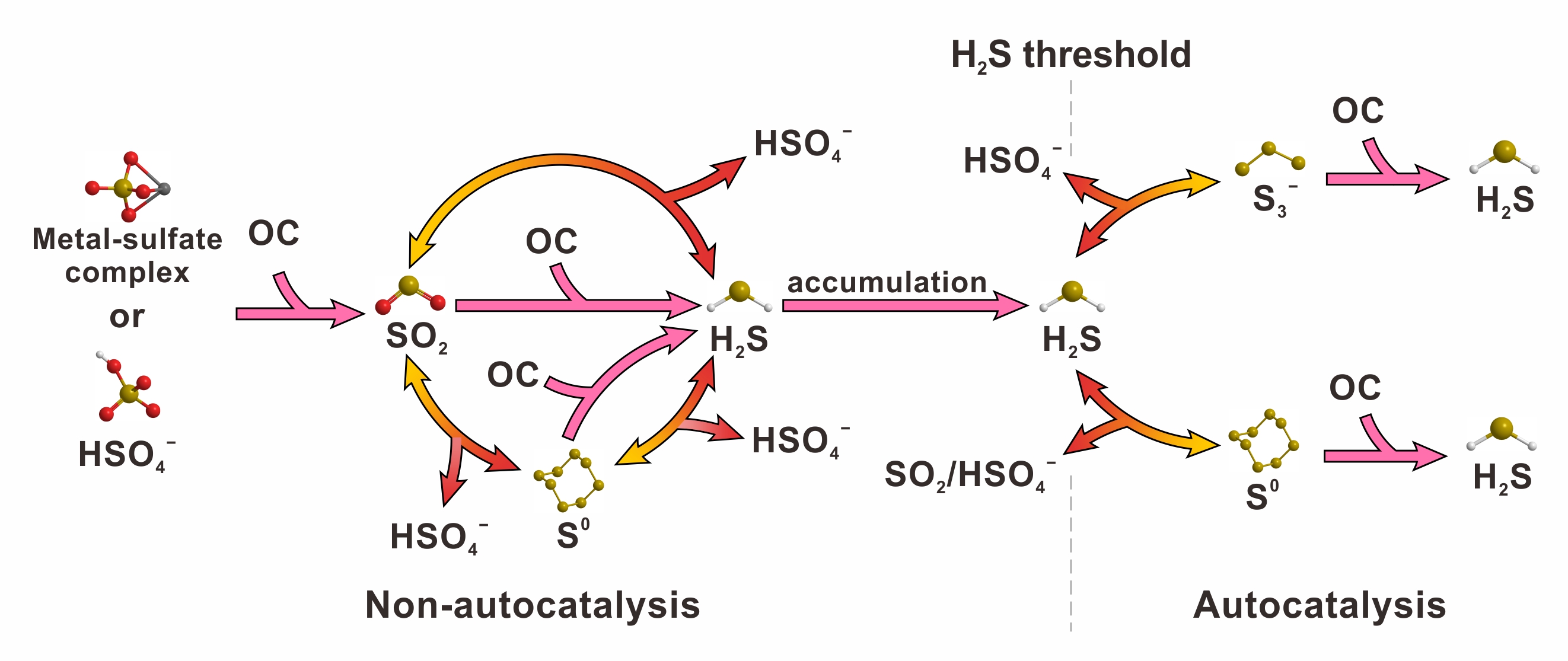 实验结果显示(以Na2SO4-H2SO4-CH4-N2-H2O体系(N2为内标)为例;图1),TSR反应中硫的转化由一系列还原、歧化和归中反应组成。硫酸盐首先被甲烷还原生成SO2,SO2再进一步被还原或歧化产生H2S。当H2S累积到门限浓度后,其与硫酸盐或SO2反应生成中间价态硫,即S0和S3-,它们随后被烃类快速还原生成H2S,同时,烃类被氧化形成CO2。本文提供了S0和S3-快速氧化烃类的直接实验证据,阐明了S0和S3-的形成是TSR自催化反应的关键。TSR反应过程中硫的转化路径如图2所示。