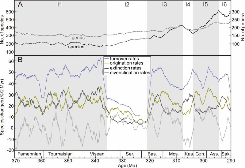 古生代大冰期阶段海洋生物多样性(A为属、种数量,B为物种变化速率),I2-I5为CPBE事件时期