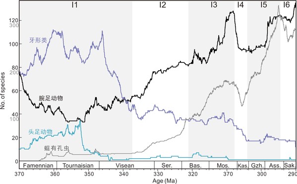 CPBE事件时期(I2-I5),䗴有孔虫、腕足动物物种多样性增加,而自由游泳的牙形类和头足动物则逐步下降