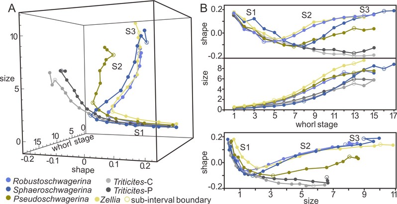 早二叠世䗴有孔虫的辐射是晚古生代冰期中生物多样性变化的一次重要事件,对海洋生物多样性变化有关键作用。其中,具有球状外形的假希瓦格䗴亚科的出现和辐射,代表了一类形态特异类群的出现。它们如何演化而来?代表了怎样的䗴有孔虫演化趋势?我中心史宇坤副教授通过一种完全定量化的形态测量学方法,研究了早二叠世假希瓦格䗴亚科最具代表性的分子,假希瓦格䗴、壮希瓦格䗴、球希瓦格䗴和车尔䗴四个属在个体发育过程中的形态变化,发现它们的祖先类群麦粒䗴,经历了加速(acceleration,形态发育速率加快)、超期发生(hypermorphosis,发育时段超期)、前移(predisplacement,发育时间提前)三种过型发生(peramorphic)过程,演化而成了具球形壳体的假希瓦格䗴亚科类群。研究提出,生物个体发育和系统发生中常见的异时发育,可能多数都复合了两种及以上的异时发育类型,是个复杂过程。这一过程的研究可以通过形态测量学方法进行量化,是生物个体发育和系统发生关系研究的良好参照。该项研究成果《Heterochronic origin of spherical fusulinid foraminifera in the Late Paleozoic》于11月26日在古生物学著名期刊《Paleobiology》上线。
