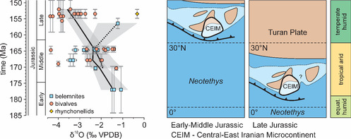Stable oxygen isotope values of calcitic marine fossils indicate a significant long-term warming throughout the Middle and Late Jurassic, which can be explained by a concurrent major plate tectonic shift of Central Iran from temperate to tropical latitudes. This southward drift also caused changes in ecosystem composition and sedimentary facies (from Lower-Middle Jurassic siliciclastics including coal beds to the development of a carbonate platform in the Callovian and the presence of evaporites in the uppermost Jurassic).