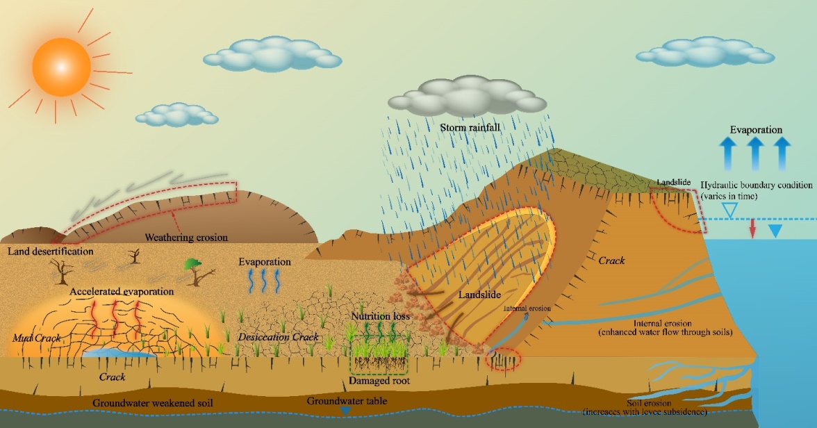 图2与土体龟裂相关的工程地质与环境地质问题示意图