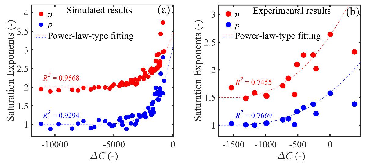图3. 理想孔隙网络数值模拟与微模型实验获得的饱和指数均与其孔隙水连通性随饱和度的变化率呈近似幂律相关关系