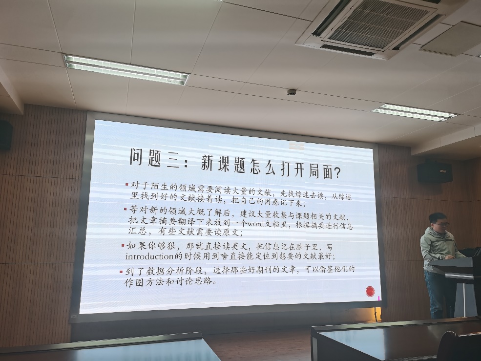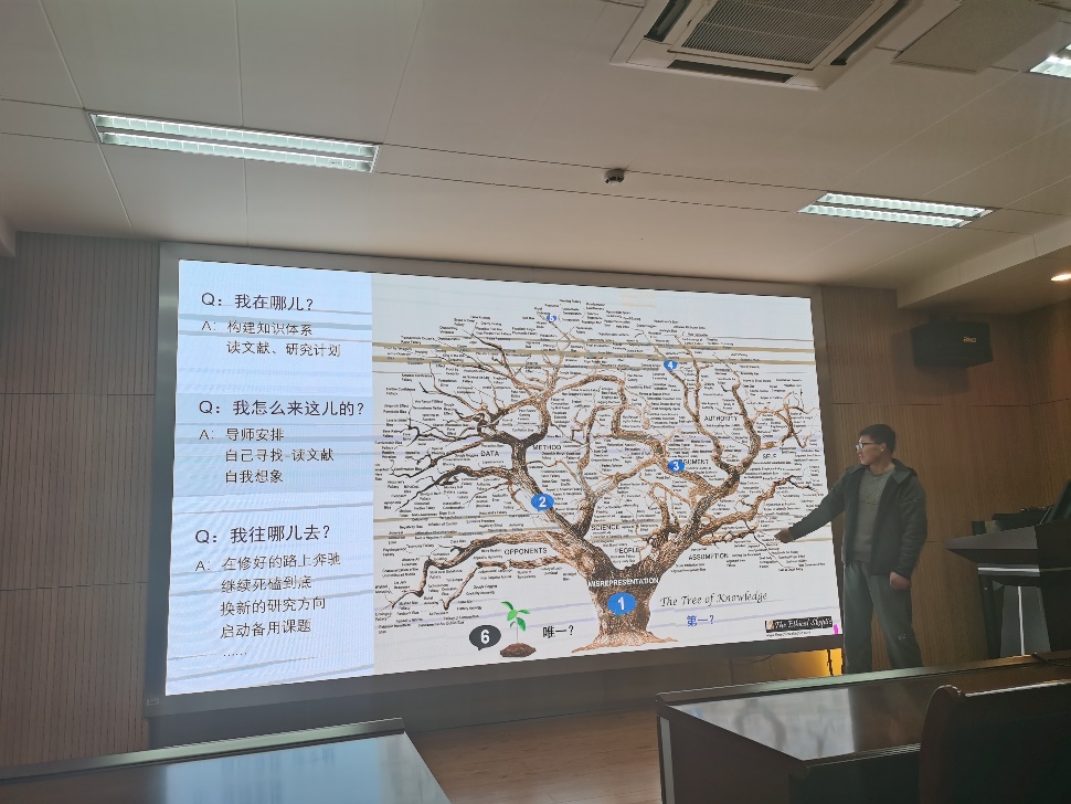 随后进行的是支部成员科研经验分享交流会,王浩贤同志以“做一名元素表生循环过程的观察员”为题展开分享。王浩贤同志首先介绍了对科学的认识、典型的科研方法以及科研探索过程中的定位及应对方法,然后简要介绍了他当前的研究课题“玄武岩发育形成的农田系统生态风险及机理”以及他的研究思路,最后鼓励支部成员在科研的道路上不仅仅只是做一个跟随者,而是需要尽可能多思考,多开展原创研究。李银川同志通过 “烦躁or焦虑怎么办”、“拖延症怎么办”以及“新课题怎么打开局面” 这3个问题,结合自己的亲身经历进行分享,强调了自我排解、和好友或导师沟通对于摆正科研情绪的重要作用。并且,在新课题的研究方面,李银川同志建议大家先读综述,在阅读过程记录下自己困惑的地方,并根据其引用文献进行追溯,从而让自己更快的进入一个新的研究领域。