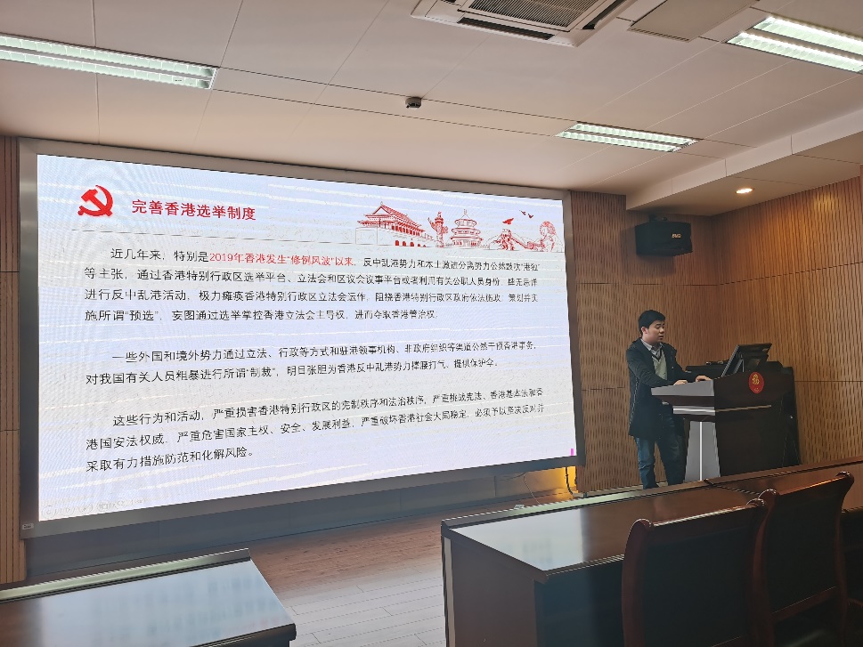 首先是两会精神的传达,夏芝广同志对“政府工作报告及十四五规划”的内容进行了整体介绍;李雯雯同志通过视频采访的形式对两会重点内容“乡村建设”进行了讲解,强调了文化产业对于乡村振兴的重要意义;刘茜同志图文并茂的介绍了两会热点话题“碳中和”,详细介绍了实现碳中和的途径以及碳中和目标;张猛龙同志从历史角度、社会发展、国家主权等方面介绍了“完善香港选举制度”的意义。