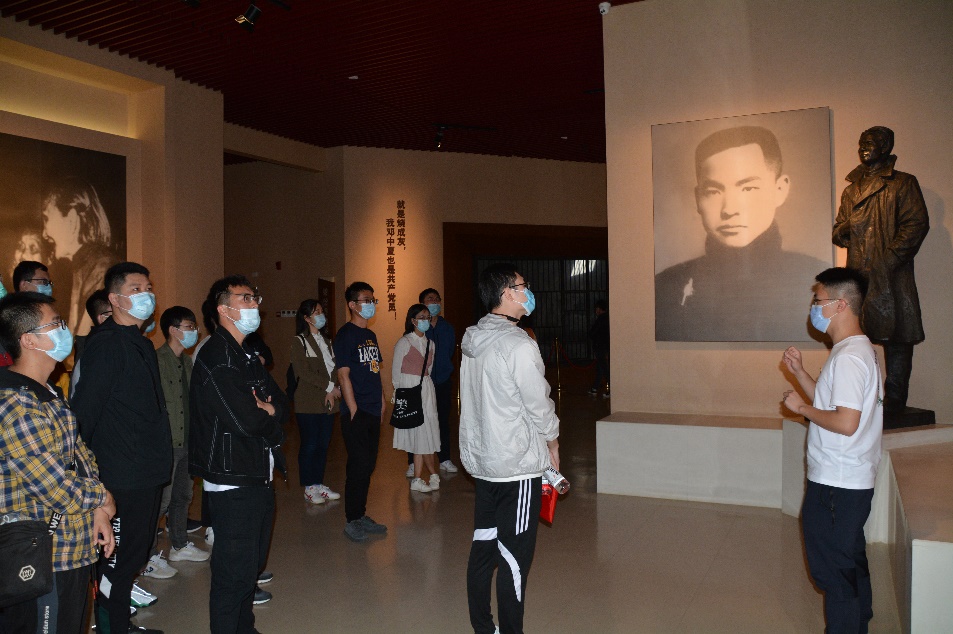在党支部书记石静同志的带领下,同志们首先进入雨花台烈士纪念馆。这是一组“凹”型两层的白色古典型建筑,层面为乳白色琉璃瓦,外墙是花岗岩贴面,正门上有邓小平亲笔题写的“雨花台烈士纪念馆”。横额的上方用花岗岩雕凿出日月同辉的图案,象征烈士精神与天地共存,与日月同辉。馆内陈列有1000余件烈士遗物、450幅珍贵图片和恽代英、邓中夏等127位烈士的事迹和文献资料。