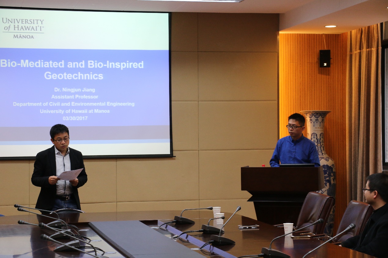 2017年3月30日,应永利集团官网唐朝生教授邀请,美国夏威夷大学土木工程系蒋宁俊博士来永利集团官网进行学术交流访问,并为永利集团官网师生作了题为“Bio-mediated and Bio-inspired Geotechnics”的学术报告。
