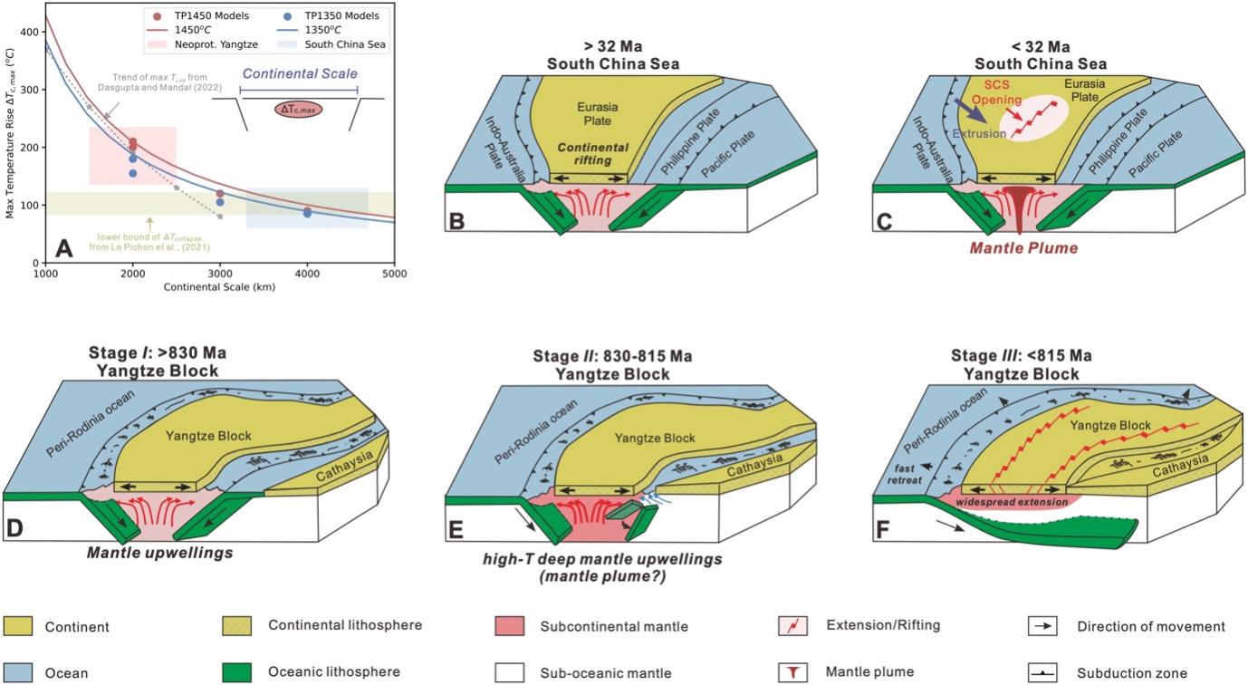 图4. (A)双向俯冲数值模拟及理论模型的比较与(B-C)南海和(D-F)新元古代扬子陆块演化过程。(A)中大陆尺度和ΔTc,max表示大陆两侧内倾俯冲带之间的距离和次大陆地幔的最大升温。(A)中的红线和蓝线分别代表1450°C和1350°C时地幔温度的理论模型结果,阴影区域代表新元古代扬子地块和新生代南海根据其大陆尺度对次大陆最高升温的估计。(B–F) 的图例显示在底部。