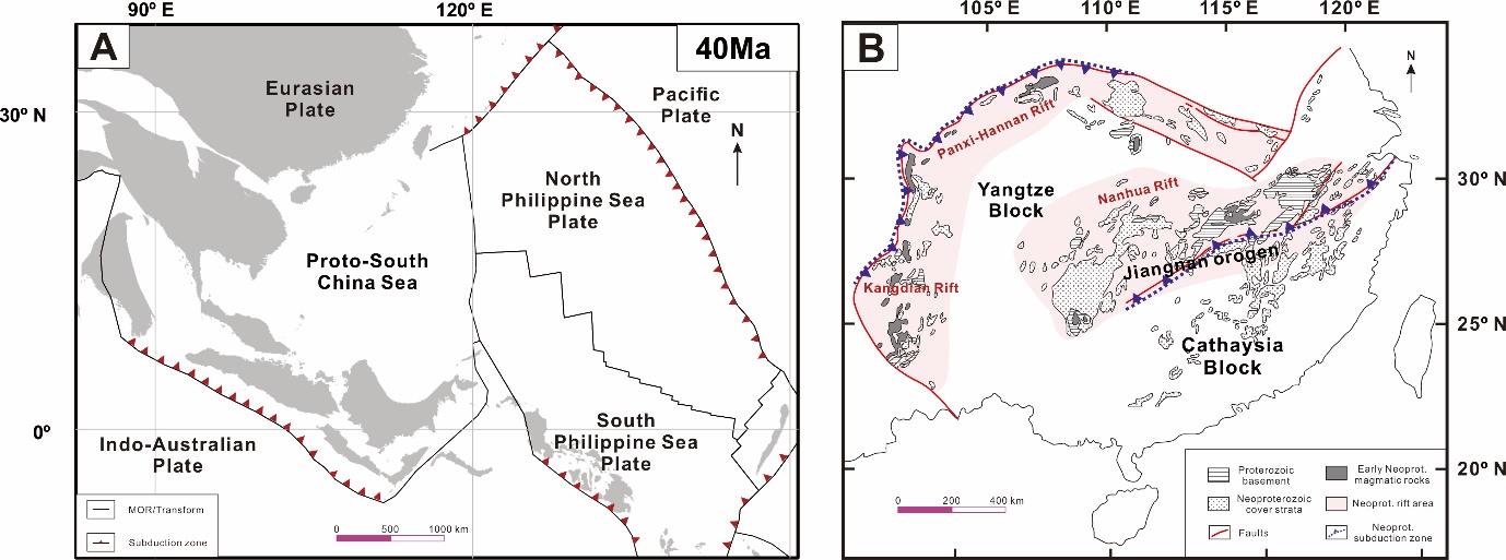 图 1. 两个双向俯冲系统相关的地质记录。(A)40Ma时期的南海区域重建结果;(B)新元古代扬子地块的地质记录。