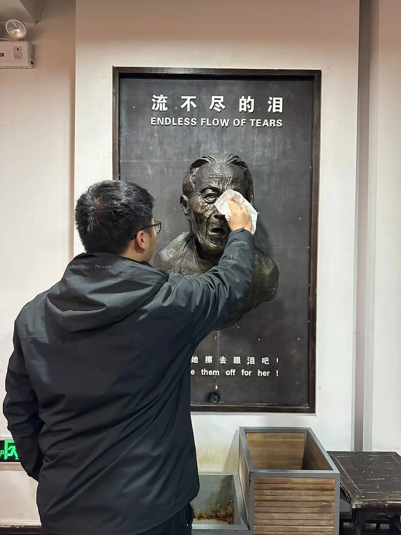 馆内1600多件文物展品、400多块图版、680多幅照片,揭露了二战期间日本军国主义对人性的肆意践踏以及“慰安妇”制度给无辜女性们带来的苦难与伤痛。展厅内,一件件文物、一幅幅照片、一段段视频无不控诉着侵略者惨无人道的暴行,党员们表情凝重,驻足良久,仿佛回到了那段山河破碎、生灵涂炭的惨痛岁月。