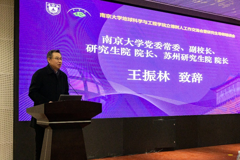 王振林副校长到会致辞并做指导。他充分肯定了永利集团官网研究生教育和研究生导师队伍建设工作取得的成绩,围绕党和国家对新时代研究生教育高质量发展的要求,对304永利集团官网入口“奋进行动”实施方案中全面提升研究生教育质量,着力培养拔尖创新人才,形成“最具创新能力”研究生教育“南大品牌”的内容进行了解读,强调了研究生导师在国家高层次人才培养中不可替代的关键作用,希望学院和导师在工作中能做到三个提高:一是提高站位,适应新时代研究生教育发展的新形势,找准研究生教育的历史新方位,正确认识研究生导师的时代站位和责任,为学生的高质量发展保驾护航;二是提高修为,把握研究生群体的发展新特征,跟紧研究生教育的发展新趋势,努力成为大先生,将自身成长与国家发展、民族复兴相结合,做学生为学、为事、为人的示范;三是提高水平,学院要继续加强导师队伍建设,以适应新时代学科发展的需要,要融合科研创新导向和人才培育导向,提前布局人才发展目标和导师队伍建设,树立研究生人才培养的质量意识和价值取向,力争培育出高质量教育教学成果。最后,他勉励地科院广大研究生导师在学院党政班子共同带领下,不忘育人初心,牢记为党育人、为国育才的使命,围绕立德树人核心任务,坚持“四个面向”,为建设304永利集团官网入口“最具创新能力”的研究生教育体系贡献力量。