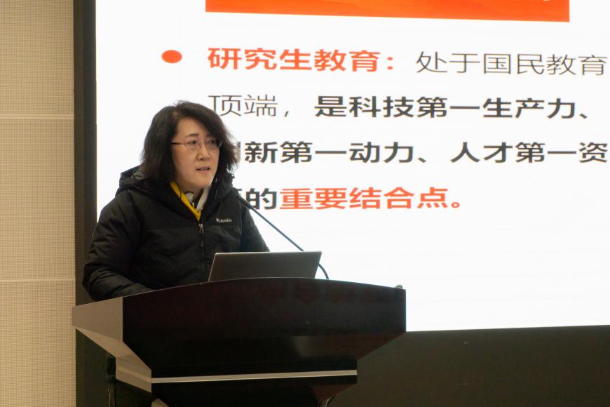 学院党委副书记毛予倩介绍了研究生思政和就业工作进展。学院研工主要围绕“立德树人”根本任务,以党建为龙头,构筑人才培养新高地;以育人为核心,实现人才质量新提升;以问题为导向,探索思政教育新路径。面对研究生的学业压力、安全管理、导学关系、就业瓶颈等问题,希望导师们利用课程育人、科研育人、实践育人、文化育人等平台,与学院一道构建面向未来和国家需求的研究生教育思政育人支撑体系。