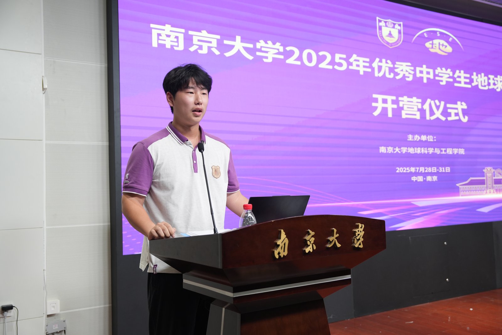 江苏省锡山高级中学新高二学生张锦轩代表全体学员发言。他表示此次夏令营是一次无比珍贵的成长契机,在这里不仅能聆听教授的讲座,还能有机会观察矿物的微观世界,他希望能和志同道合的小伙伴共同开启这段探索地球科学奥秘的旅程。