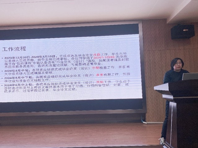 黄璐璐老师详细讲解了毕业论文要求。她对2024届本科毕业论文工作的通知做了解读,强调了论文查重和抽检制度,提醒同学们注意论文的格式规范,确保论文质量,同时牢记各个阶段的提交时间节点,做事要有提前量,以免忙中出错,导致论文进程延误。