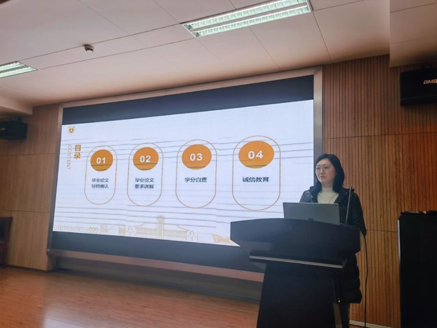 董婷书记勉励保研、考研和就业的同学向不同的目标保持奋进的姿态继续前进,她结合本科生院的工作经历,对大四毕业生的学业自查、毕业论文、选课以及课堂出勤给予提醒,并对同学们寄予殷切期望。
