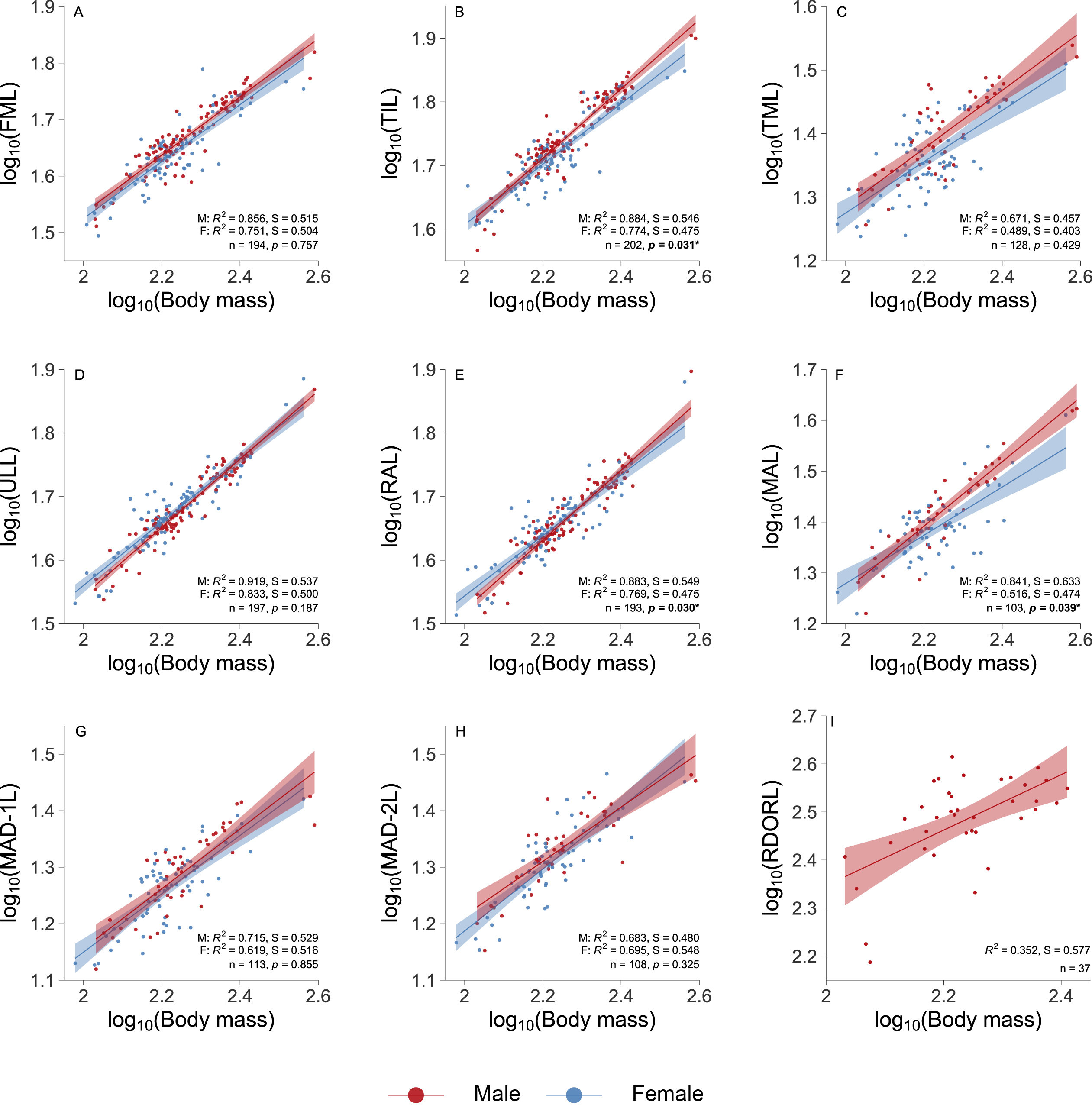 圣贤孔子鸟是最为著名的中生代基干鸟类之一,它在早白垩世热河生物群有数千件保存完好的标本,许多保存有精美的骨骼和羽毛,这为研究性选择对已灭绝脊椎动物的演化提供了机会。在圣贤孔子鸟的化石中,一些标本具有独特的以羽轴为主导的一对装饰性长尾羽,而其他标本则没有,所以早期的研究认为这样一对装饰性长尾羽是雄性所特有的性状。在此,研究人员基于圣贤孔子鸟迄今为止最大的样本量,对其进行了形态测量与统计学研究。研究结果确认圣贤孔子鸟的标志性的一对装饰性长尾羽是性双型特征。此外,还发现圣贤孔子鸟在个体大小、骨骼相对长度和异速发育上均表现出性双型(图1、2)。雄性圣贤孔子鸟相较于雌性圣贤孔子鸟拥有更大的体型(图1)。同时雄性圣贤孔子鸟后肢和大掌骨相对于体型的相对长度也比雌性更长,这是由于雄性圣贤孔子鸟后肢和大掌骨相较于雌性的生长速率更快所导致的结果(图2)。研究者认为雄性相对长度更长的后肢可以补偿其装饰性长尾羽所带来的空气动力学损失,这与现生的长尾鸟类中雄鸟往往有着更长的翅膀相类似。此外该研究认为在雄性圣贤孔子鸟中体型更大的个体、后肢更长的个体会有着更高的繁殖成功率。