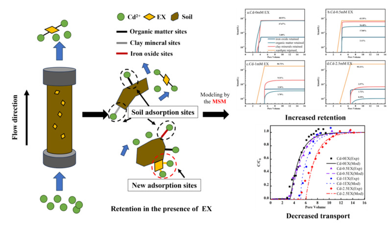 为解决上述问题,永利集团官网罗博闻硕士研究生和陈扣平副教授通过两年的努力,建立了多表面形态络合反应模型(MSM),该模型刻画了典型重金属(Cd2+)与矿区浮选药剂(乙基黄原酸盐,EX)在实际土壤中的反应过程,并基于实验结果,成功应用该模型预测不同条件下EX对实际多孔介质中Cd2⁺运移过程的影响,揭示Cd2⁺在土壤各组分中的滞留机制。
