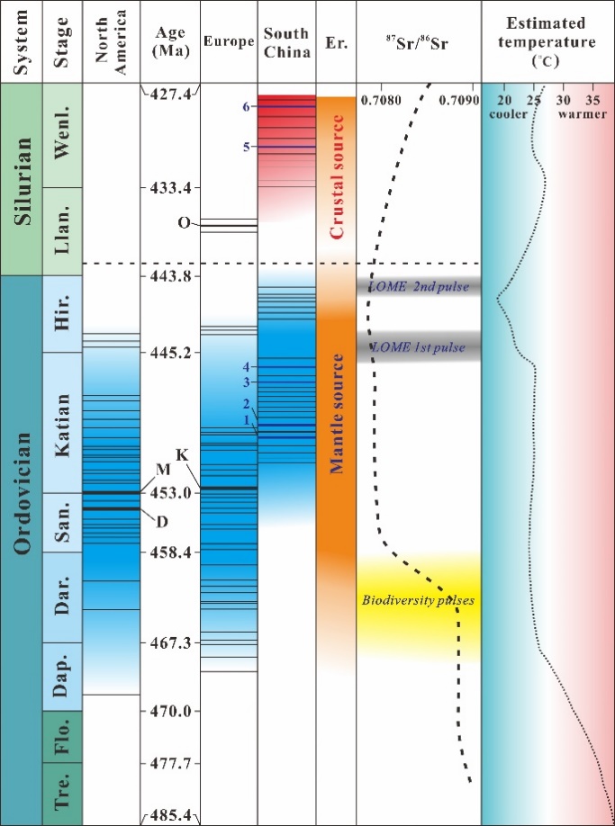 Recently, the research group of Professor Hu discovered a typical marine section that across the Ordovician/Silurian transition, with numerous interbedded volcanic ash layers (more than 100 layers) in Zhenjiang, Jiangsu Province. Based on paleontological identification, zircon U-Pb dating and element and isotope geochemical analysis of volcanic ashes, they found that the volcanic activities lasted at least 22 million years (449.3 ± 3.6 Ma to 427.6 ± 4.1 Ma) and therefore became the first to propose that the initial time of the Late Ordovician mass extinction in South China was 445.14 Ma. This time is very close to the reference time (445.2 ± 1.4 Ma) given by the International Commission on Stratigraphy, and it also provides a relative accurate time frame for the global comparison of the Late Ordovician mass extinction events and environmental evolution. In addition, geochemical analysis indicates that the volcanic eruption has two different sources up section. The early eruption was dominated by relative basic parent rocks, and containing much mantle components. The late eruption was dominated by relative acidic parent rocks, and involving a large number of crustal components. This finding well explains and furtherly supports the hypothesis that volcanism caused the sharp decrease in marine strontium isotopes during the Late Ordovician (Figure 1), and it also provides a new perspective for the controversial studies of the early Paleozoic tectonic background in South China. The spatial coupling of volcanism and source rock indicating volcanic materials could promote primary productivity, and volcanic input would be an important factor for the development of source rocks.