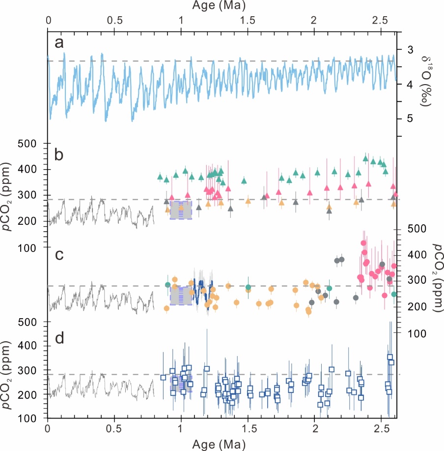 The results show that pCO2 generally varied within 180 and 300 ppm since the early Pleistocene (Figure 2d), which is lower than the 200-400 ppm reconstructed from marine proxies, and is more line with the pCO2 records recently recovered from the Antarctic blue ice.This indicates that the Earth system has been operating under relatively low CO2 levels throughout the Pleistocene (Figure 2). The results support the conclusion based on General Circulation Model which says that, a pCO2 threshold below 280 ppm is necessary for the build-up of large-scale Northern Hemisphere Glaciation. This research also shows that there were no significant differences in interglacial CO2 levels before and after the Middle Pleistocene Transition (MPT, about 1.2 to 0.8 million years ago). As a key climate transition period, the MPT marked the transition of the glacial-interglacials from the obliquity-dominated 41,000-year cycles to the 100,000-year cycles, with the increase in the amplitude of global climate changes. The cause of the MPT eventraises widespread discussion within academia. One of the main views is that a continuous decrease of atmospheric CO2 concentration triggered the MPT. However, the results of this research do not support this view.