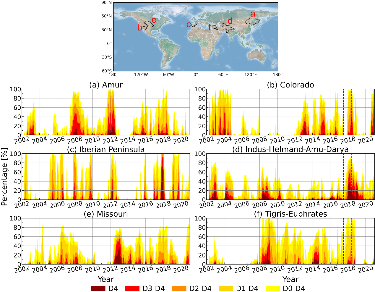 图 32002-2020年六个流域不同等级水文干旱发生面积占比,两条虚线之间为BCNN填补的GRACE(-FO) 2017-2018观测空白期干旱演化过程