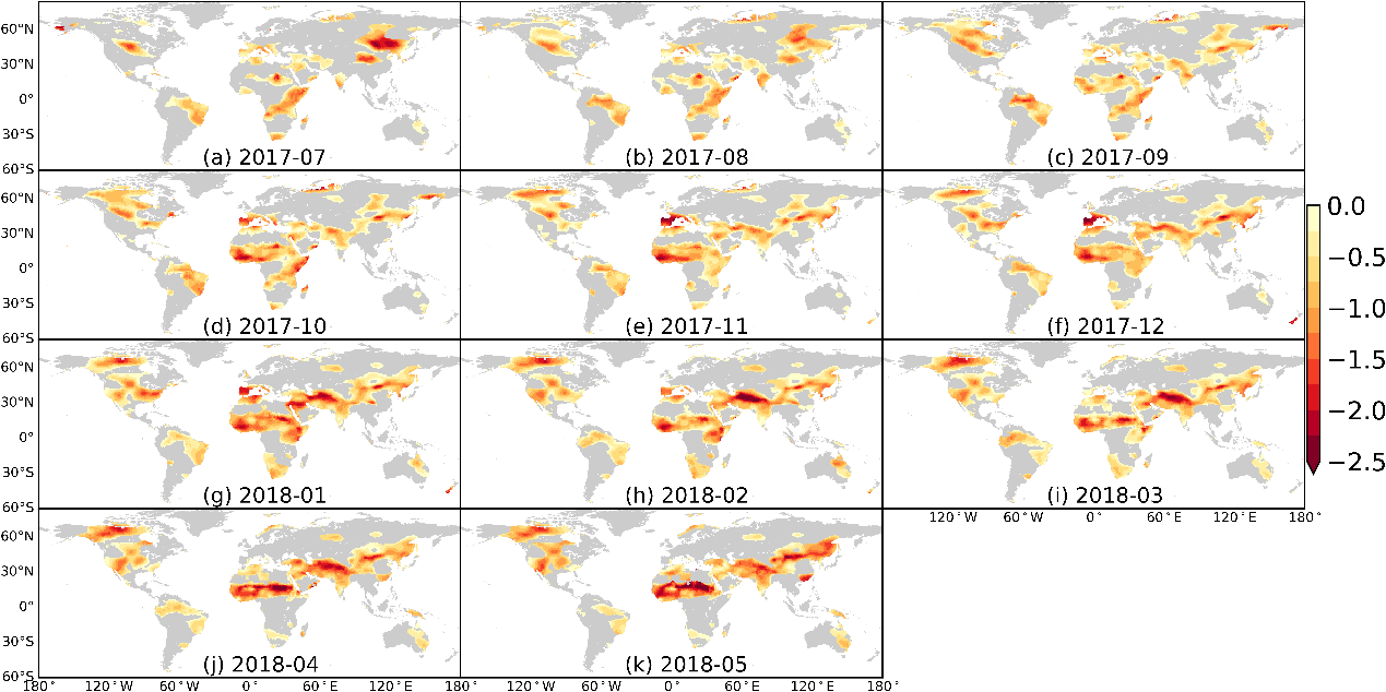 图 2 基于标准化水文干旱指数识别的GRACE(-FO) 2017-2018观测空白期全球水文干旱时空演变