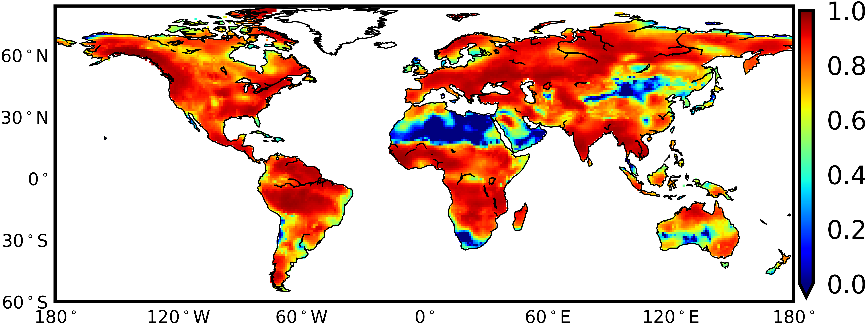 图 1 基于GRACE(-FO)验证数据集计算的BCNN纳什效率系数NSE重建精度分布(接近1.0为佳)