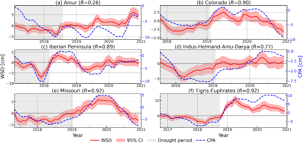 图 4 六个流域在2017-2018年水文干旱期间水储量亏缺(WSD)和累积降水距平(CPA)