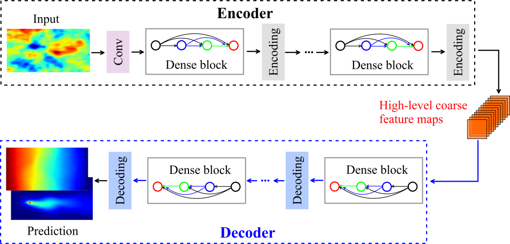 永利集团官网吴吉春教授和施小清教授团队与美国圣母大学Nicholas Zabaras教授合作,提出了一种深度卷积编码-解码网络(deep convolutional encoder-decoder network)方法来构建深度神经网络替代模型(surrogate model)。与传统机器学习方法不同,该方法创新地将非均质介质场和模型响应输出场作为图像,利用卷积神经网络强大的图像数据处理能力去解决“维度约束”问题,进而通过替代模型显著地节约计算消耗。通过求解一个参数维高达2500维的CO2地质封存多相流模型不确定性分析问题以及一个686维的地下水污染源识别问题验证了所提出方法的有效性和稳健性,该方法能够精确高效地刻画地下水多相流模型和污染物运移模型的高维输入-输出场的函数关系,有效地解决了“维度约束”这一瓶颈。