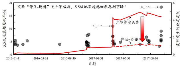 图2. 立即停注关井(实际)和停注-返排关井(模拟)策略下MW 5.5级地震的超越概率。通过实施“停注-返排”关井策略,MW 5.5级地震超越概率急剧下降,意味着破坏性的MW 5.5级浦项地震有可能被避免。