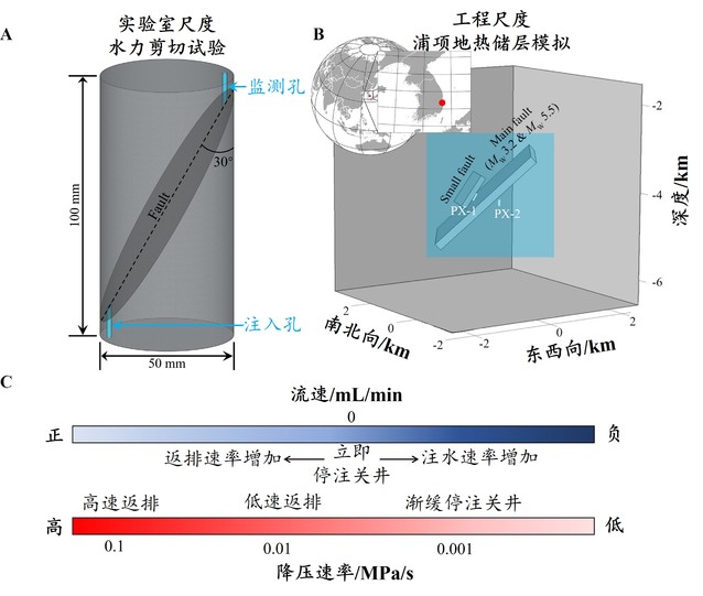图1. 实验室尺度试验与工程尺度数值模拟及关井策略示意。(A)实验室尺度试验中的试样。注入孔用于向含岩体界面的干热岩样品中注入蒸馏水,并执行不同的关井策略;监测孔用于记录远离注入端的孔隙压力变化。(B)用于模拟韩国浦项干热岩储层中孔隙压力演化的现场尺度数值模型(红点为韩国浦项的地理位置),包括两条断层及注入井PX-1和PX-2的裸眼段(修改自Yeo等,2020)。MW 3.2级与MW 5.5级地震均发生在主断层上。(C)实验与模拟中采用的关井策略示意图。“立即停注关井”通过将注入速率设为0 mL/min来实现;其余三种策略通过将孔压下降速率控制在0.1、0.01和0.001 MPa/s来实现,分别模拟“高速返排”、“低速返排”及“渐缓停注关井”过程。