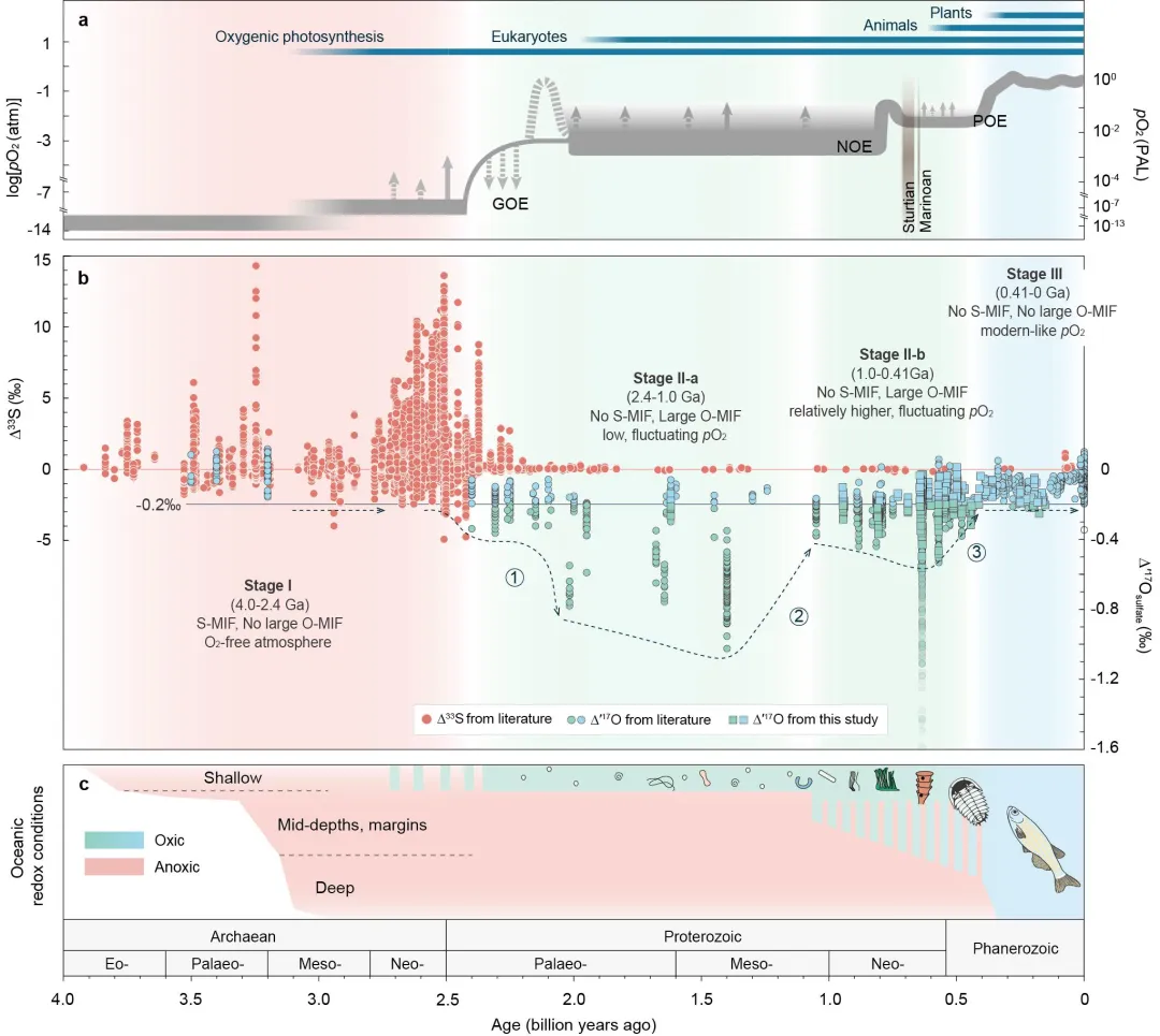 图1. 40亿年来沉积硫酸盐的Δ33S 和Δ17O记录首次直接刻画了地球大气三阶段氧化(即:24亿年之前为近乎无氧状态;24至4.1亿年期间为相对低氧、动态波动并阶段性升高,包括24-10亿年极低且波动的大气氧含量和10-4.1亿年相对较高且波动的大气氧含量;4.1亿年后进入稳定的富氧状态)及其与已知的大气、海洋和生命演化记录的对比。a) 地球大气氧分压(pO2)和生命演化;b) 本文集成的沉积硫酸盐的Δ33S和Δ17O记录;c) 海洋氧化还原状态和生物演化。引自 Wang et al. (2025) Nature。