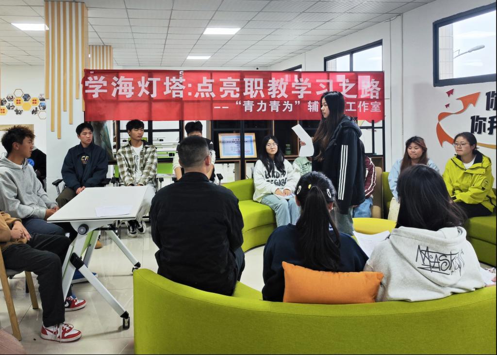 为深入贯彻落实立德树人根本任务,切实提升学生专业认同感与职业自信心,2025年11月6日下午,“青力青为”辅导员工作室在学校学生一站式社区组织开展“学海灯塔:点亮职教学习之路”主题教育活动。本次活动共有50余名师生参与,现场秩序井然,取得良好成效。